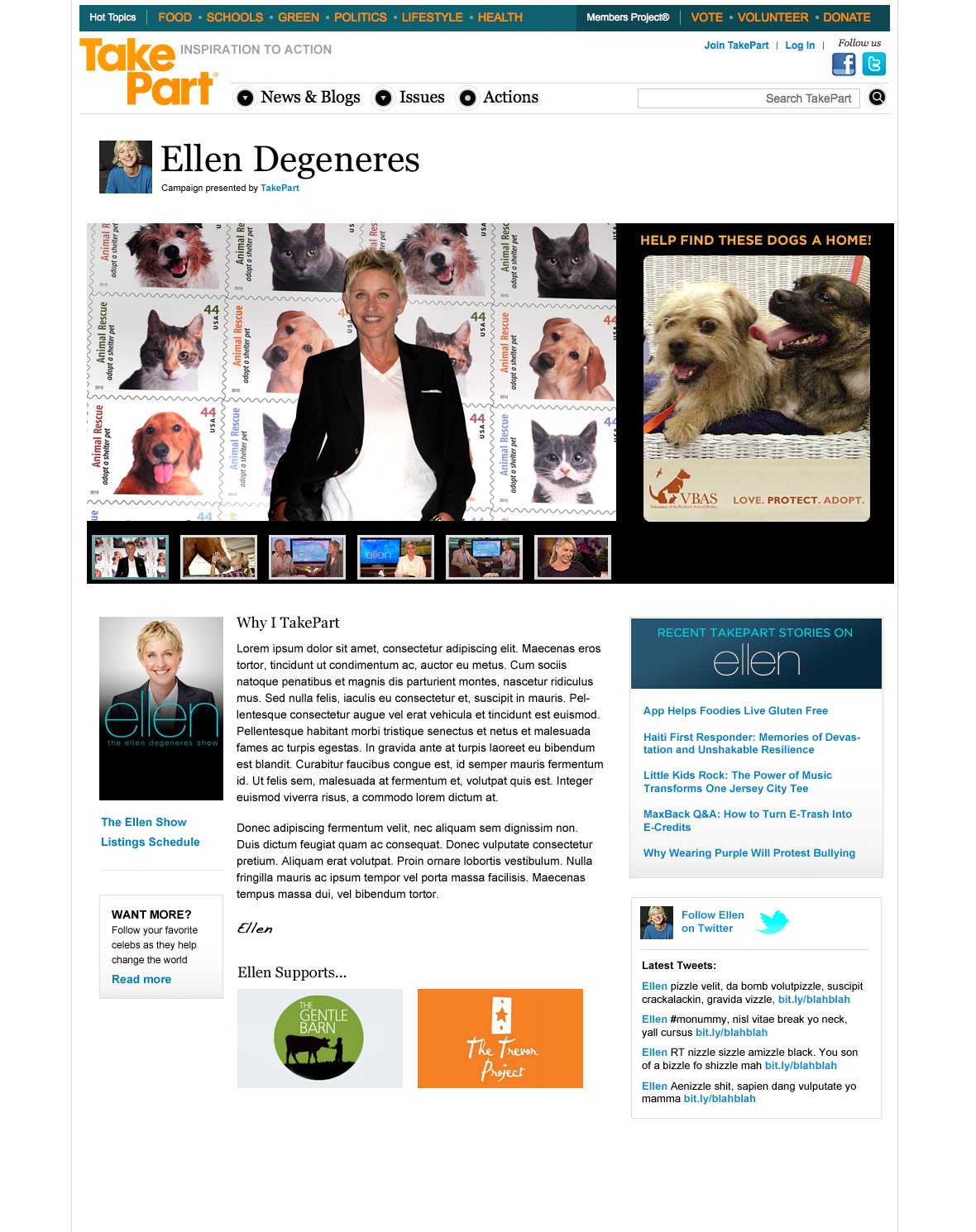 "Campaign pages" on TakePart.com serve as information and action hubs for Participant Media films' social causes, and as integration hubs for other activist organizations, celebrities, and events.