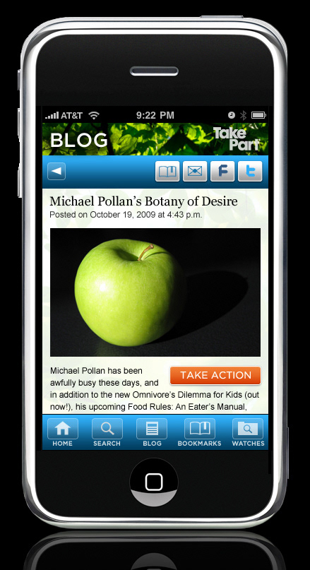 TakePart.com's mobile app was designed to deliver editorial blog content as well as specific action or volunteer opportunities from the TakePart.com site.